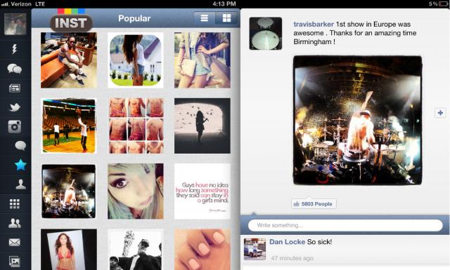 它的免费和收费版均允许用户浏览并评论Instagram上面的照片,批量上传照片,使用各种滤镜编辑照片,或将照片上传到Facebook上。此外,用户还可以看到Facebook和Twitter上面的消息和私信,搜索相关的热门话题,完成签到,或者听Hype Machine上面的免费音乐。可以说,MyPad的功能非常齐全也非常强大。