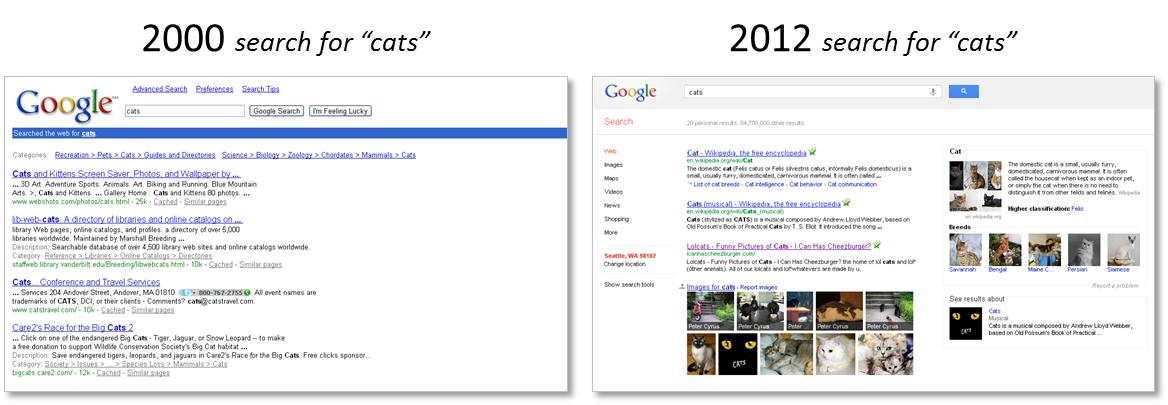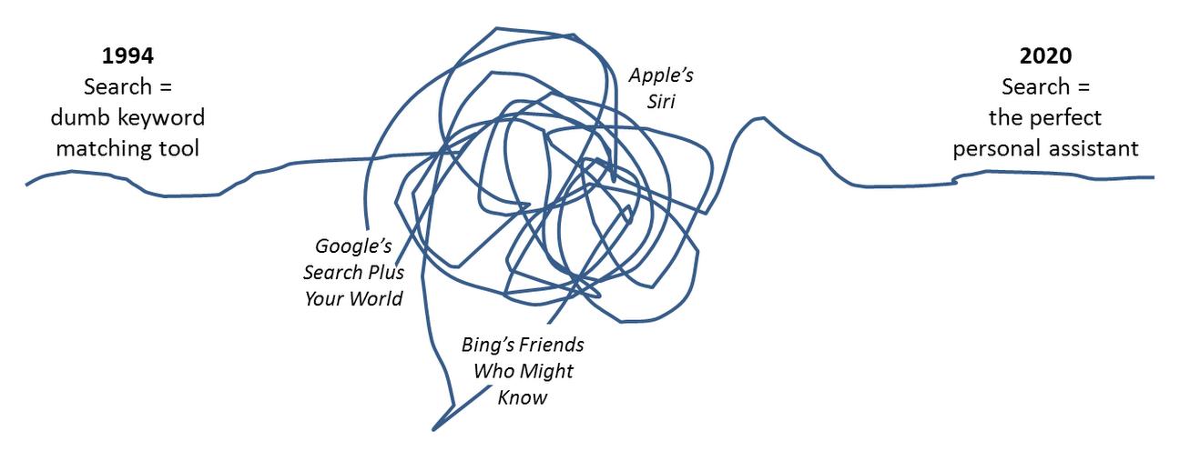 模式转变的关键是有一个像人一样认识人类的软件。现在的搜索正在对传统的通过搜索框进行查询的模式进行大规模的改造,以便理解各自有故事、有背景、有不同关系的人们的输入。这意味着正确的搜索结果取决于谁在搜索。是的,不同的人应该有不同的搜索结果。