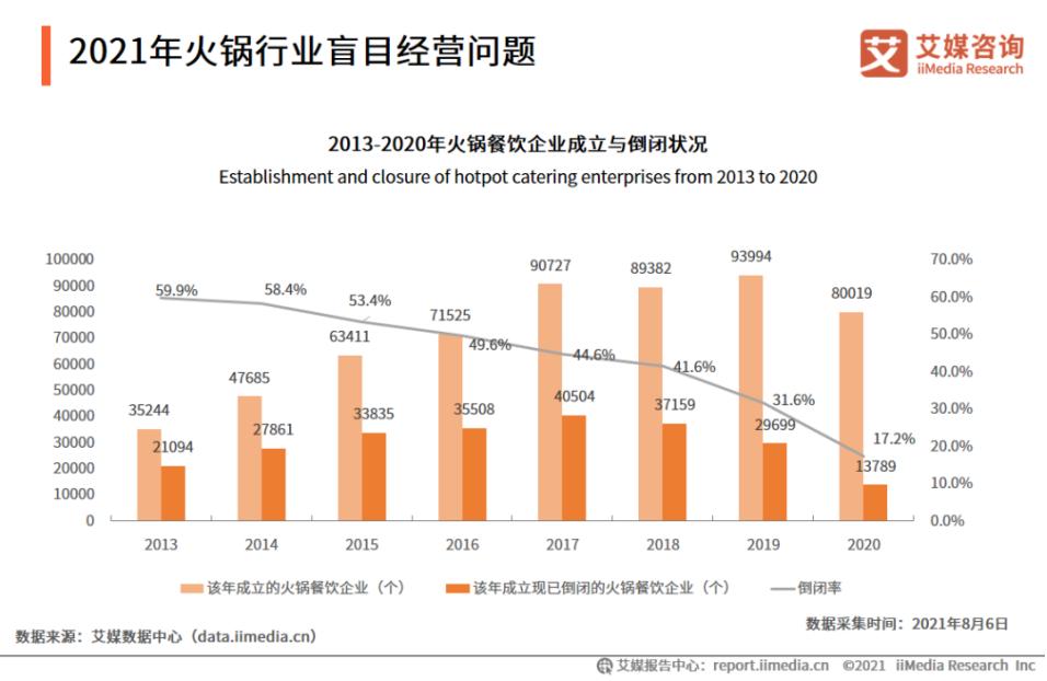 过去几年,火锅品牌雨后春笋般涌现,但裁汰率也高得可怕。据艾媒咨询数据,2016年和2019年成立的火锅餐饮企业倒闭率分别约为50%和30%,有半数左右的火锅餐饮企业活不过5年,约3成的火锅餐饮企业在两年内倒闭。