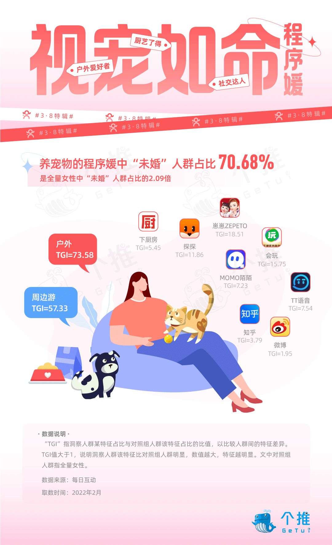 每日互动在《2022年热门消费人群洞察》报告中曾对“铲屎官”人群进行数据分析,发现最爱养宠物的就是“程序员”,女程序员当然也不例外。因此,每日互动大数据还对养宠物的程序媛人群进行了洞察。