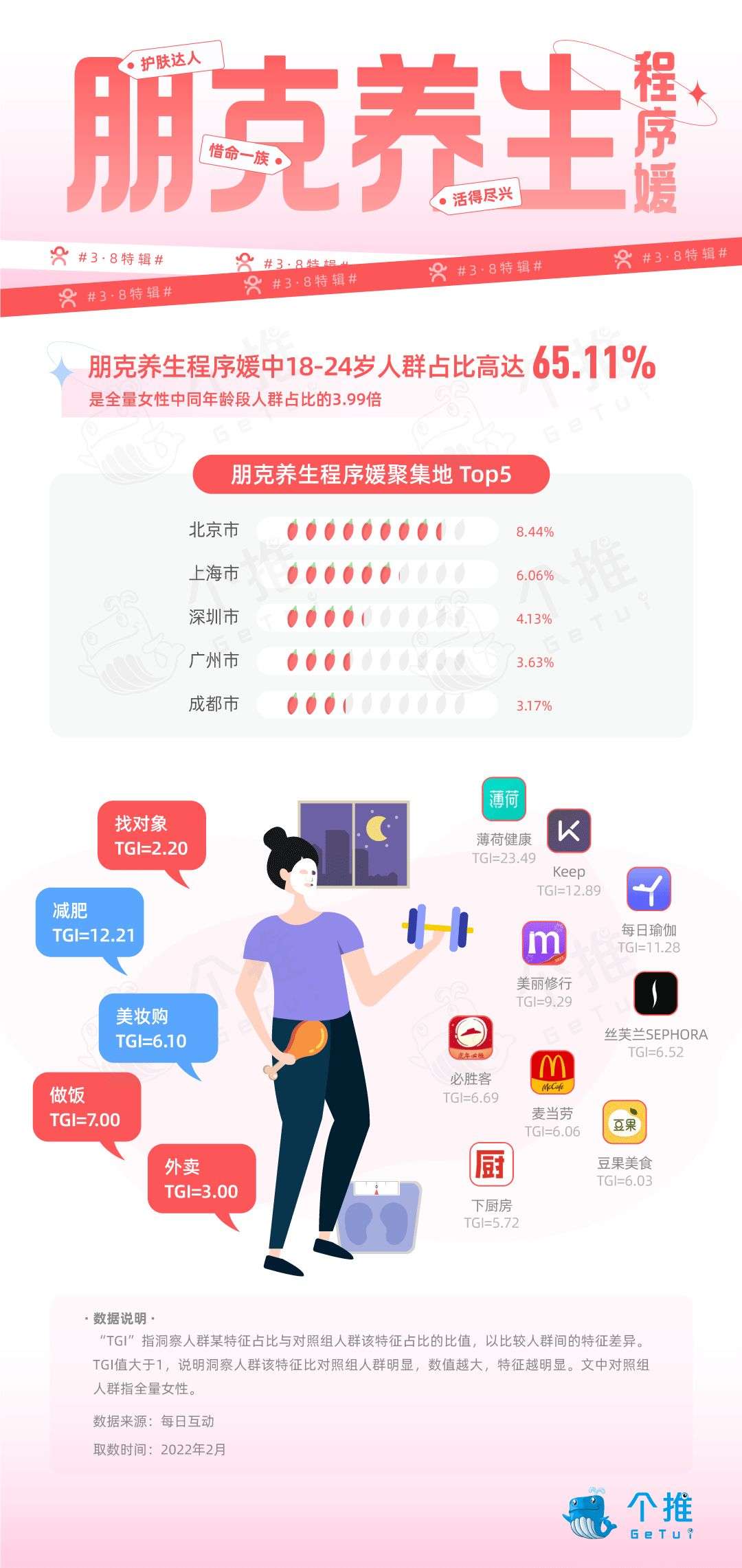 数据洞察结果显示,超60%的朋克养生程序媛是95后,北上广深和成都是朋克养生程序媛分布地Top5。单身女程序员是这一群体的主力军,她们对“减肥”“做饭”“美妆购”偏好明显。她们坚持最严格的护肤,会下厨做菜,也经常点外卖,她们活跃于各大运动类App之间,对更美、更健康的追求不会停歇。