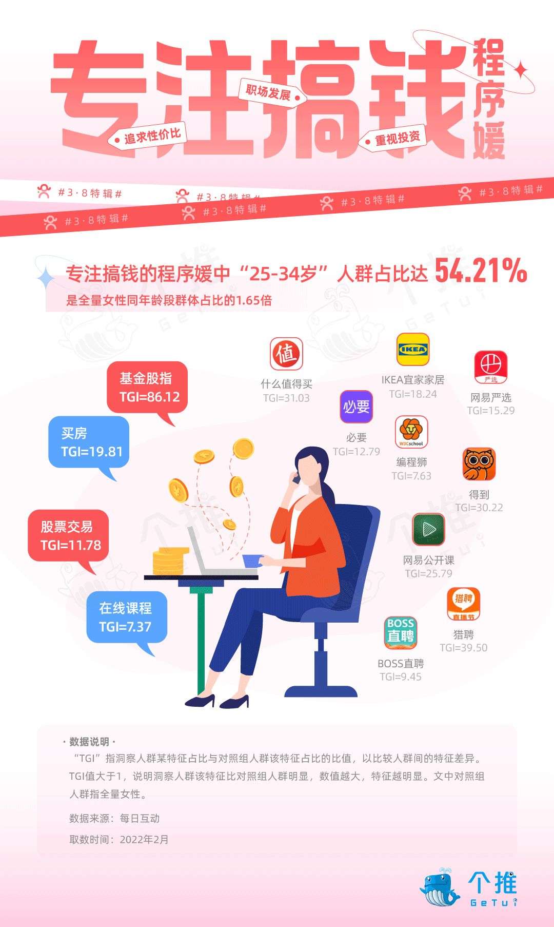 程序媛们不仅赚得多,她们的消费理念和投资眼光也很长远。每日互动在程序媛中首先挖掘了热衷投资理财的细分人群,我们称呼她们为“专注搞钱”的程序媛。