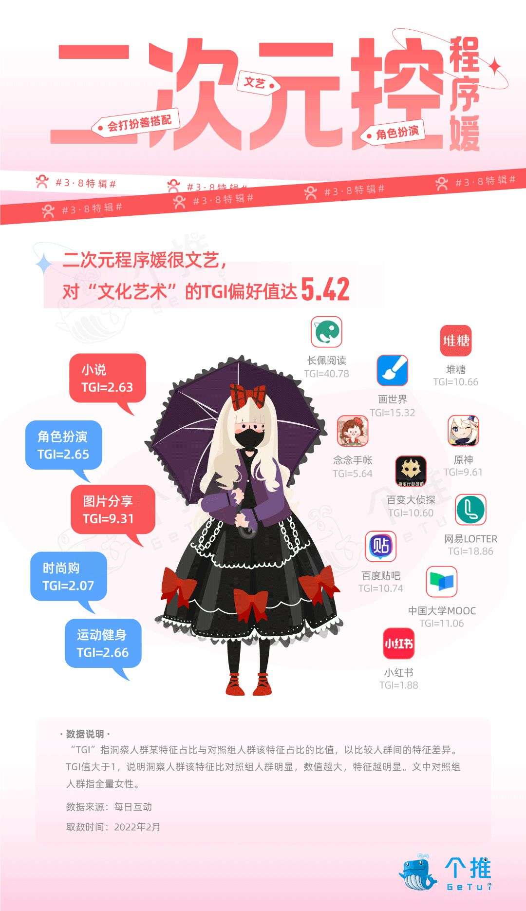 每日互动大数据显示,程序媛多是动漫迷,相比全量女性,她们对动漫视频的TGI偏好值达3.53。每日互动继续关注了喜欢动漫的程序媛人群,并对她们其他维度的特征偏好进行了分析。