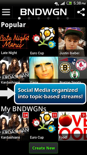 用户需使用facebook登录BNDWGN,然后选择聚合来自如facebook,twitter,Youtube 和Instagram的内容,并订阅你的社交网络内容中所关心的东西的分类。这个分类可以是大到如“科技”这个级别的分类,也可以是小到如“Lady Gaga”这个级别的分类(如下图中Euro Cup的分类)。由于这些BNDWGN频道(BNDWGN channels)是由用户创造的,所以用户可以随意向它添加内容。