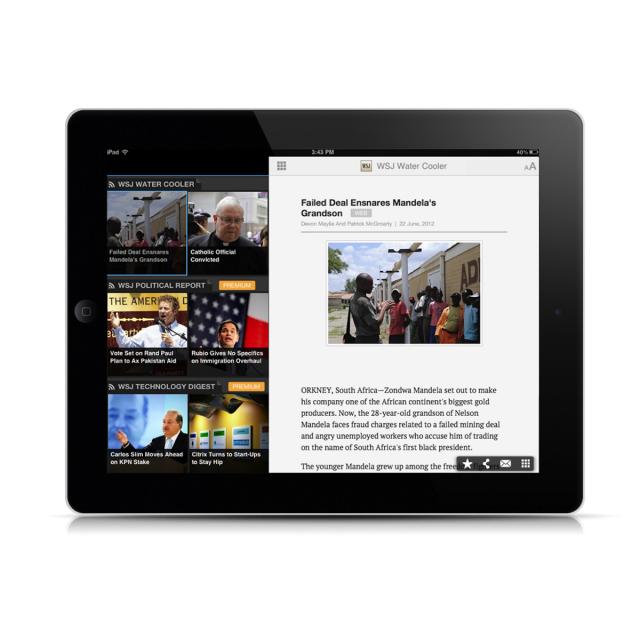 在应用内购买”的方式定制三个WSJ的频道:科技频道和政治频道每月3.99美元, 命名为”Water Coller”的精选频道价格为每月0.99美元。对于WSJ来说,自1997年起他们只采用过付费墙服务(wikipedia: