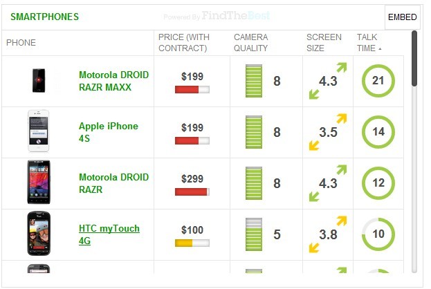 操作过程很简单:只需选定你感兴趣的主题,点击“嵌入”按钮,定制好模块大小和图表中你希望包含的产品信息即可。如果你的读者通过你博客中嵌入的图标进行了某些购买行为,你也能获取相应的报酬。由于FindTheBest的数据都来自政府、研究机构和其他可靠数据库,另外数据来源透明,数据选取、分割、处理的工具都非常可靠,因此你大可对图表提供的信息准确度放心。