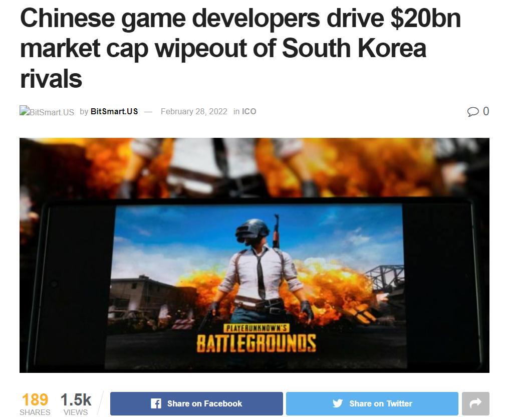 英国《金融时报》引用韩国记者Song Jung-a的报道,韩国游戏市场现在的问题包括:MMORPG极端付费模型引起用户反弹、利用区块链技术和NFT推出play To earn(P2E)类型游戏反响不及预期,并把中国游戏出海竞争导致韩国头部游戏企业市值蒸发200亿美元放在了文章开头。