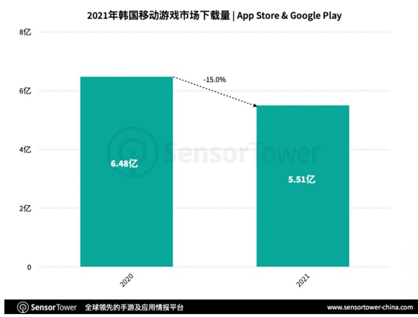收入上升但活跃下滑,另一方面,2021年的韩国市场也出现了类似的状况。根据Sensor Tower 商店情报最新的数据显示,2021 年韩国移动游戏市场收入同比增长 6.5%,达到 57.2 亿美元,下载量同比下滑15%。