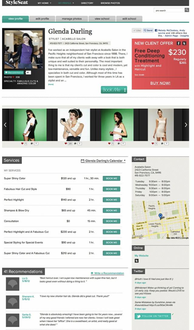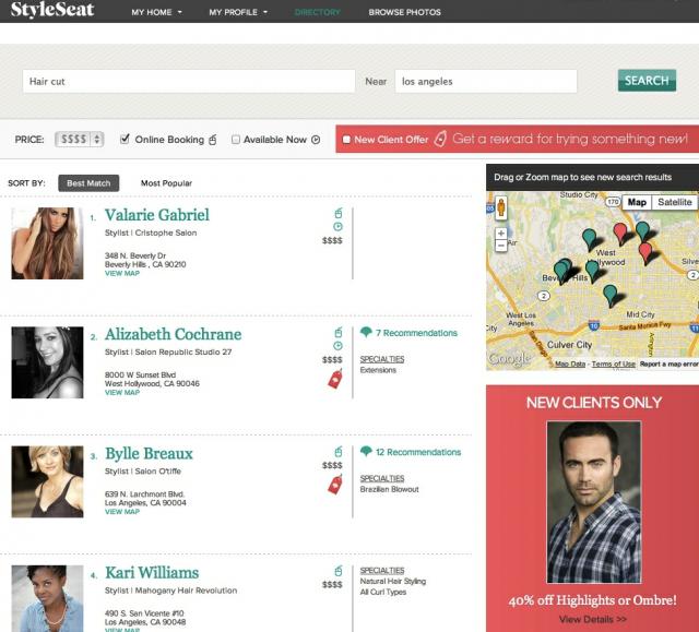 StyleSeat便是一个解决这些问题的网站,这里就像一个发型师们的“公开赛”。顾客可以在网站上做到浏览各地沙龙或者根据具体位置信息寻找专业发型师,获得发型师的特长、各类名目的价格、评价、效果照片等信息,并可以直接在网上根据发型师的日程做直接预约。今天,这家网站推出了一个新的服务“新顾客优惠(New Client Offers)”,允许发型沙龙通过提供折扣或者额外服务吸引潜在新顾客,这些折扣信息会适时地出现在网站中。