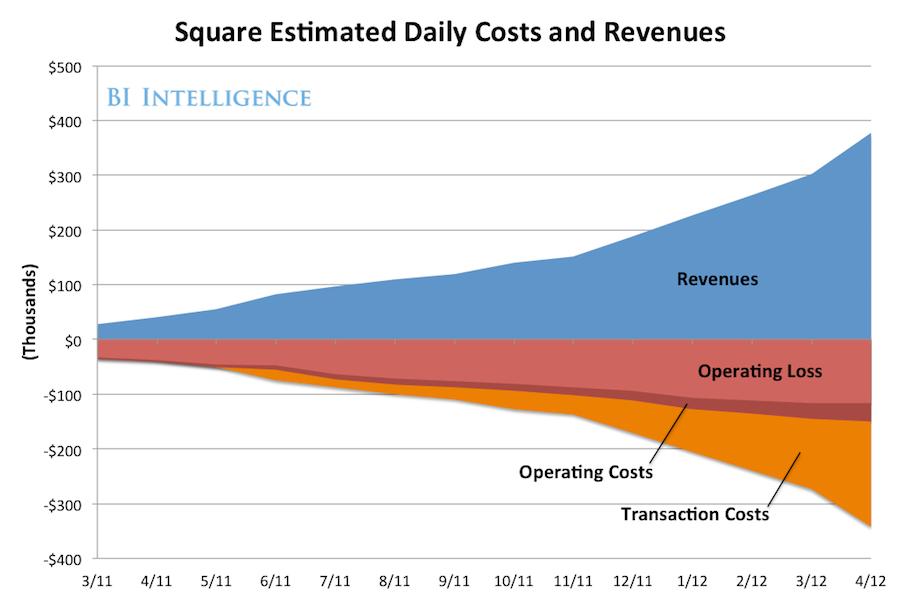 这张图表是我们对Square的收入和开销的一个预测,实际它很好地支持了上面的观点:Square目前还需要大把烧钱,因为它的业务规模还是相对较小。但是,随着支付量的增加,它在业务经营上的优势就会越来越明显。换句话说,Square的业务是一种典型的规模化经营。