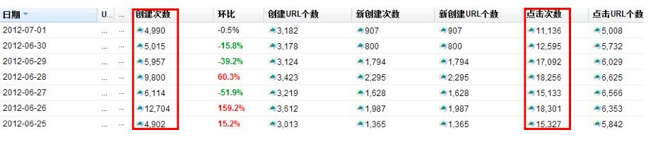 创建次数是指用户一键分享、自己手动发布的微博次数总和,而短url个数则是指被分享了多少篇新闻。从这张图上可见,用户每日创建的url数远远少于被点击而产生流量的url数,这显示出,过去数天乃至更长一段时间内被分享、发布的微博仍在产生长尾效应,而且还不低。