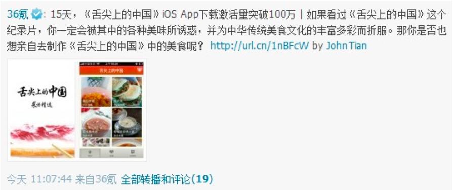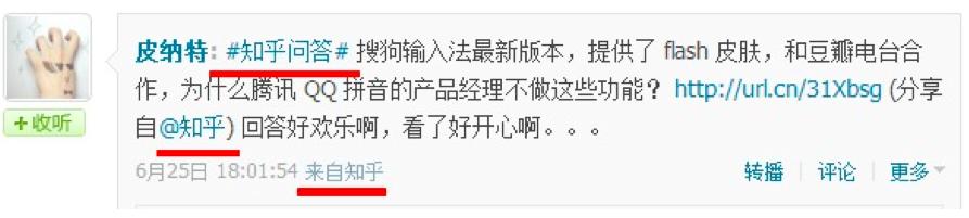 知乎上的分享对这一体验就非常注重,添加话题、@自己的官方账号,如果在分享的信息中有涉及到用户有绑定腾讯微博,也会把回答者的腾讯微博账号@上。当然,还有申请来源字段显示。这点上,36氪分享过来的信息也是如此,并努力在每次分享上都带上图片。