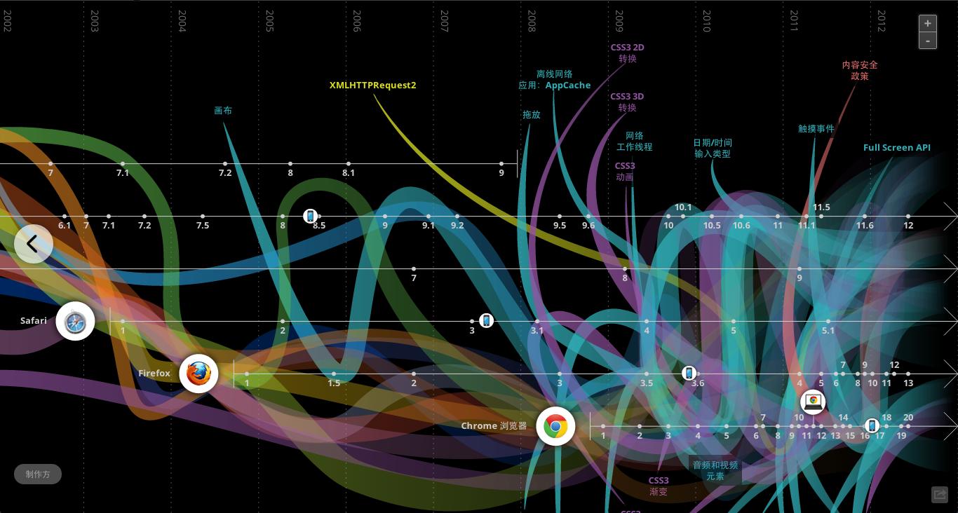 该信息图以一种动态形式全面展现了HTTP到HTML 5等网页技术的发展历史,以及网景、IE、Safari、Firefox以及Chrome等浏览器的完整演变历史过程,同时对全球互联网的发展也做了全面展示。下面我们来看看这个动态信息图的完整版,你也可以 点击这里查看: