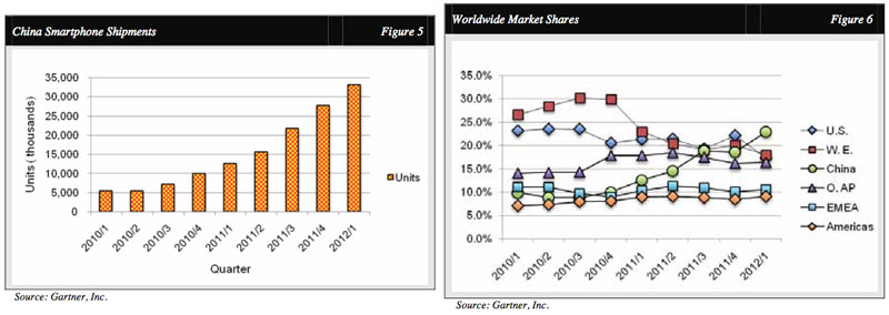 根据Needham & Company提供的数据,中国已经成为最大的智能机市场。第二季度中国智能机销量增长率为164%,达到3310万部,而美国同期只卖出了2500万部。