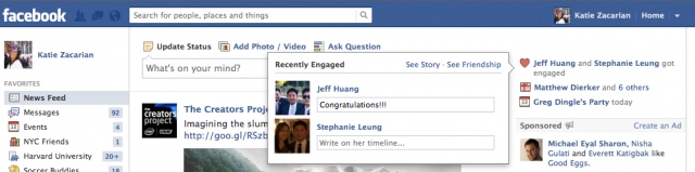 而今天Facebook针对朋友的Relationship信息也做了一个改进。从今天起,如果你的朋友在自己的资料中,将Relationship改成与某人订婚或与某人结婚。这一消息就会立即在准新人朋友首页的右边侧栏上、朋友生日消息的上侧出现。用户可以在不离开主页的情况下点击这一更新,祝福结婚订婚的新人,还可以将朋友的另一半也加为好友。而根据Facebook的说法,朋友结婚或订婚的这一事件并不会加到Events当中,只会出现在主页上。