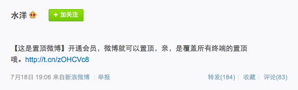 新浪微博的@水洋 在微博上透露置顶功能不只在Web端生效,同时也会覆盖其他所有终端。但是要使用这个功能你必须开通微博会员。