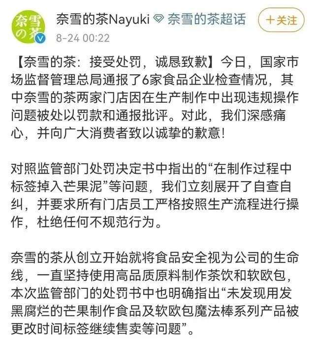 作为新茶饮代表,奈雪的茶食品安全问题长期受相关部门和消费者关注。去年8月2日,新华社报道称,奈雪的茶北京西单大悦城店、长安商场店等多家分店存在“蟑螂乱爬、水果腐烂、抹布不洗、标签不实”等问题。随后奈雪的茶表示道歉关店整改。