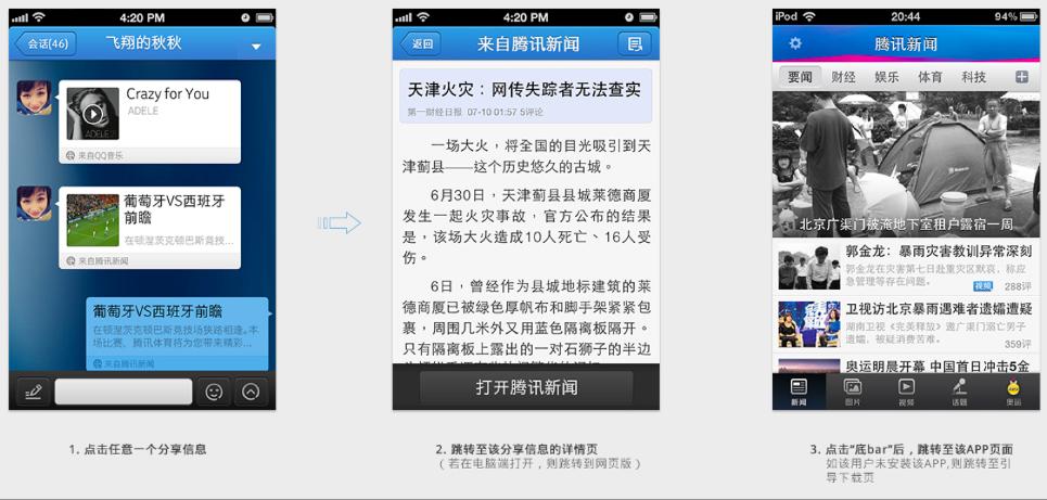 比如说我正在使用腾讯新闻或网易新闻客户端看奥运,那么我可以把我看到的某一条新闻直接分享给我QQ上的好友,他们无论是使用手机还是电脑都能够在聊天窗口中阅读我分享的新闻,如果在手机端,分享内容的底部还会有一个“打开app”的链接,点击后要么直接打开手机里的app,要么跳到app store去下载该app。