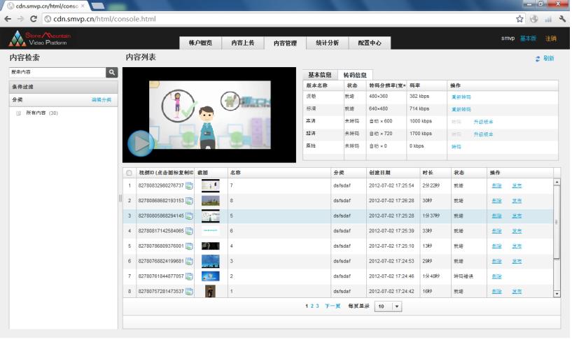 与优酷、土豆等面向大众用户的产品相比,石山视频提供了更为全面的后台管理功能。用户可以直接在网页端同时上传多个视频,并能够对码率进行设置和管理。转码就绪后,你还可以在分享前对视频播放界面进行详细设置,包括播放器的风格、播放窗口尺寸、是否显示水印LOGO等。