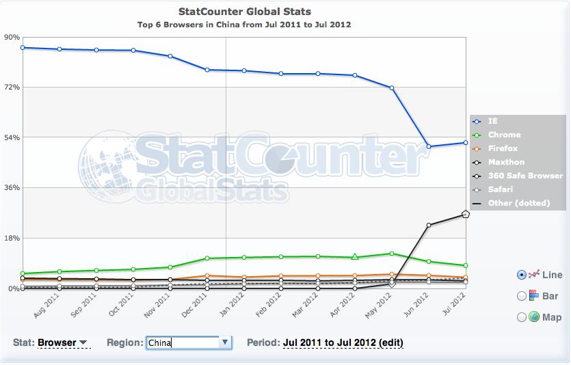 但是在中国市场,IE仍然占据着50%的市场,不过已经比5月份的数据下降了近20个百分点,5月份IE占据国内浏览器近