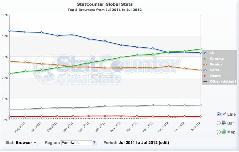 Google Chrome浏览器全球份额超过1/3,但中国市场IE仍然占据半边天
