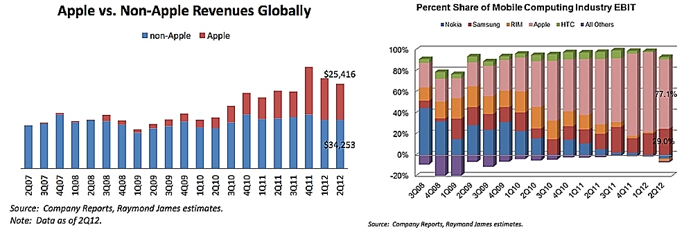 因为当你用更大的视角审视整个移动产业时,你会发现,苹果借助iPhone和iPad的巨大毛利润,在总收入和运营利润上都远远超过了它的其他竞争对手们——包括三星,可以说是一只独秀。
