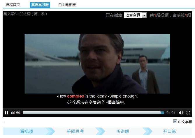 如上图,在网站端,魔方英语的课程由“英词学习版”和“自由电影版”两大块组成,每个视频的学习由看视频、答题思考、听/看讲解、开口练四个步骤组成。