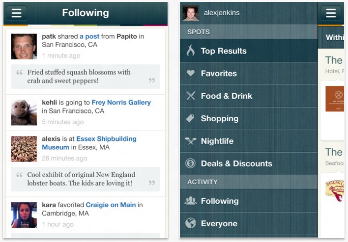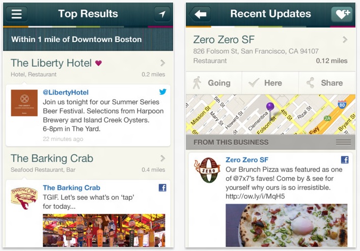 第二,Spindle利用了“隐形搜索”的概念,用户一打开应用,通过自动定位就会看到周边实时的或即将发生的商家优惠信息。这些信息根据餐饮、购物、夜生活、折扣来分类,用户可进行简单浏览、查看详细介绍、地图引导来消费。如果你喜欢某一家餐馆或活动,你可以点击收藏,以后再有优惠活动Spindle可以直接推送给你。另外Spindle也支持在facebook等社交网络上签到、关注好友或查看活动。