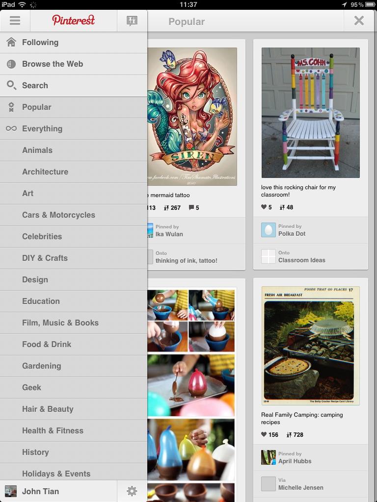 在移动端,Pinterest延续网页上的瀑布流模式,可以进行在网页版上进行的各种操作,如Pin图、关注以及搜索等。但是移动端的页面布局与网页版稍有不同,在移动端,个人信息和各种操作都通过浮动菜单形式显示在左面(如下图)。