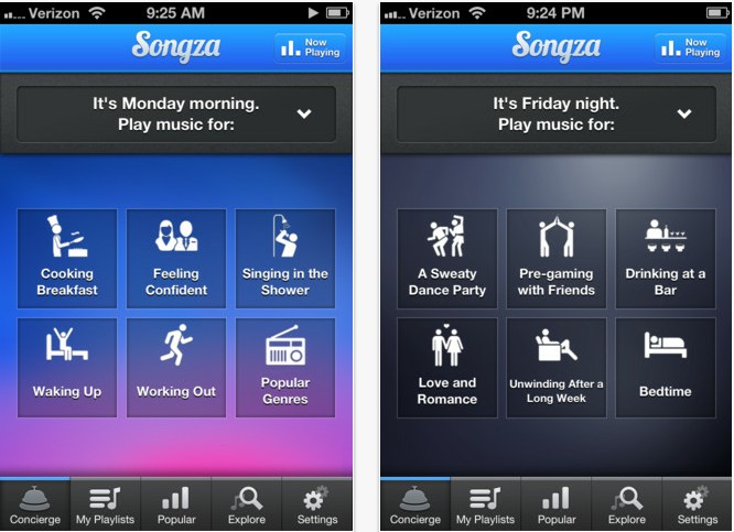 Songza提供的服务可以实现在适当场合听适当的音乐,而不是没有选择地随机播放。因为他们专门针对各种场景创建适合的音乐播放列表,让你很容易就能找到符合场景的音乐。