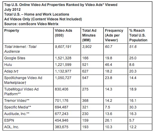在广告播放量方面,Google 以15亿次排在首位,其次依次是Hulu (12亿次)、Adap.tv (11亿次)、SpotXchange Video Ad Marketplace (10亿次)、以及TubeMogul Video Ad Platform (8.3亿次)。视频广告播放总时长为39亿分钟,Adap.tv 广告播放时长最高,为6.27亿分钟。7月52%的美国人曾观看视频广告,平均每人观看61次。Hulu向观众发送广告的频率最高,平均每位观众为46次,ESPN为26次。