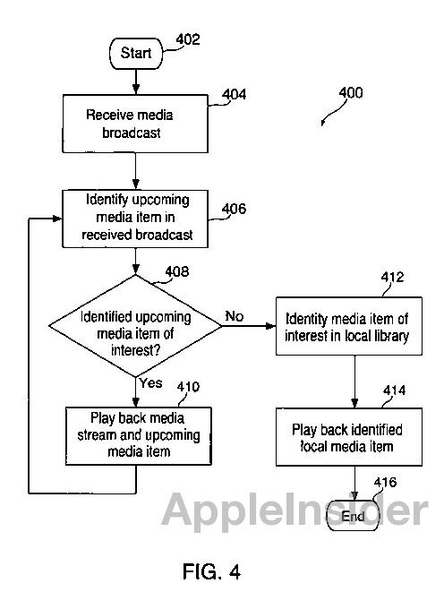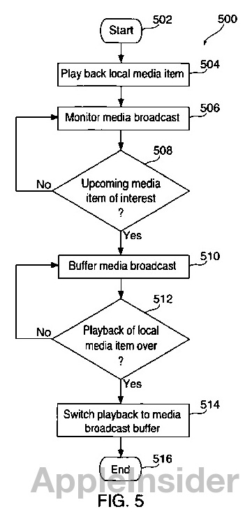 本地媒体与电台之间的无缝切换&OS=an/apple+and+isd/8/21/2012&RS=(AN/apple+AND+ISD/20120821))”(Seamless switching between radio and local media),根据描述,该技术能在两种媒体源中自动切换。当检测到某个媒体源有用户不想看到的内容时,该系统会自动切换至其他媒体源。而当用户不想看到的部分如广告播放完毕之后,该系统又会自动切换至之前的媒体源。
