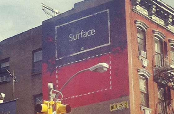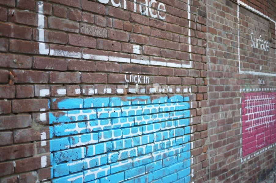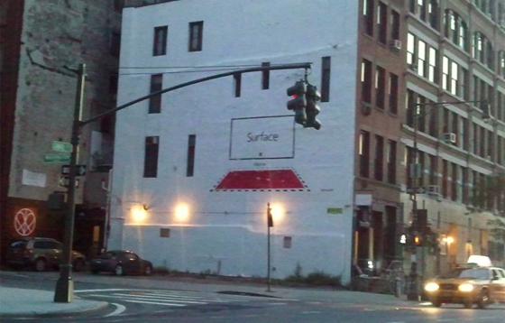 10月26号才正式发布,虽然还有两个月多的时间,但微软似乎已经开始着力推广他们的产品了。近日人们发现在纽约街头的一面建筑物的墙上,赫然出现Surface的涂鸦。这些涂鸦中并没有出现Surface的配置价格信息等广告内容,只是轮廓与六月份发布的Surface几乎一模一样,而且键盘颜色也与我们之前照片上见过的非常像,能让人一眼就看出来:这就是微软的新平板电脑----Surface。