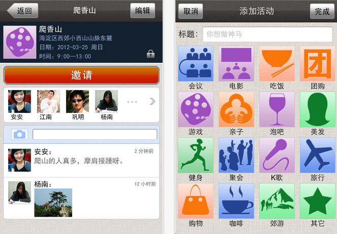 此外,他们还准备引入公众活动功能,让用户可以从“我联系”中查看到近期、周围有哪些公开活动,比如演出、电影、讲座、相亲交友、免费体验等。增加用户与好友、与兴趣相同的人的线下交流,使应用具备线下社交功能。