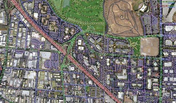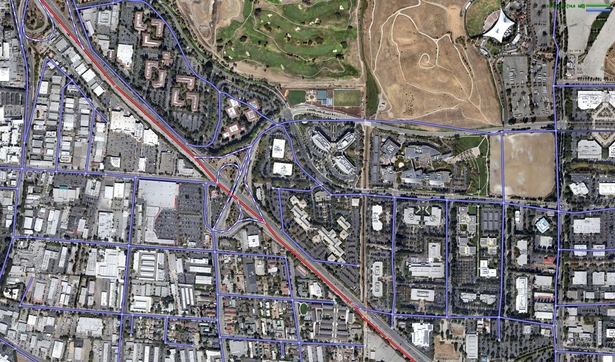 让搭载着定制相机的街景车走遍全世界,这个主意值得大家致以敬意。目前Google的街景车已经行驶了500多万英里,这些里程为地图制作提供了两类有价值的信息:其一是街景车实地走过的路径,这意味着到底那些路是走的通的;其二是拍摄的照片,通过它们Google可以利用算法分离出其中的交通信号,并将这些信息嵌入到Google地图的深层中去。如此处理后,旧金山的某个闹市区就成了这个样子:
