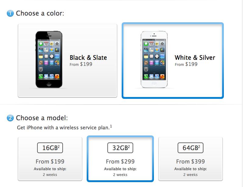这里所说的被预订一空是指苹果在一周之内发货的预订,并非指全部预订的结束。现在苹果官方网站仍然可以预订,不过发货时间已经调整为2周。此次预订包括了黑白双色、16GB/32GB/64GB的iPhone 5,价格从199美元、299美元到399美元,如下图: