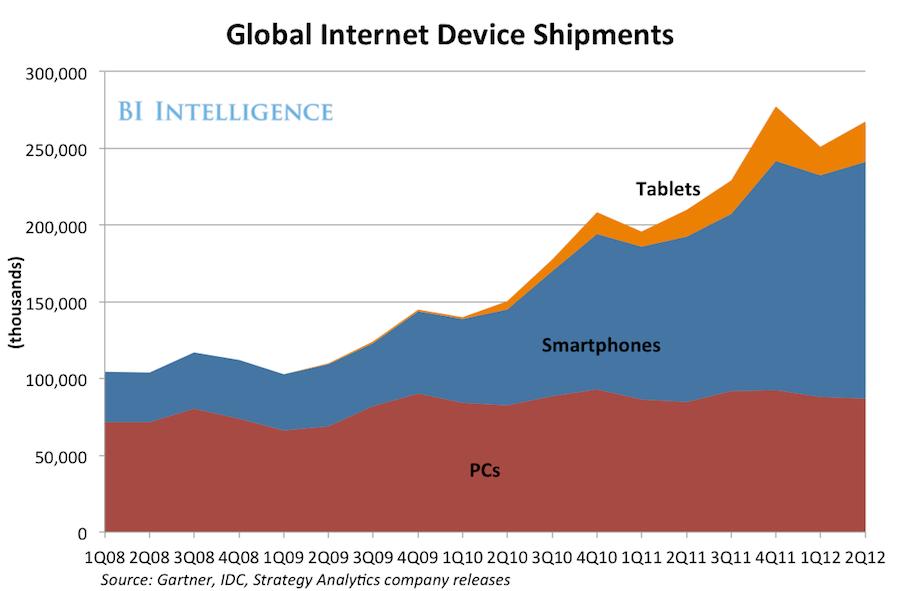 BusinessInsider的研究数据也显示,自2008年以来,智能手机与平板电脑的出货量量不断增加,而PC的销售量整体变化不大,甚至出现萎缩的情况。