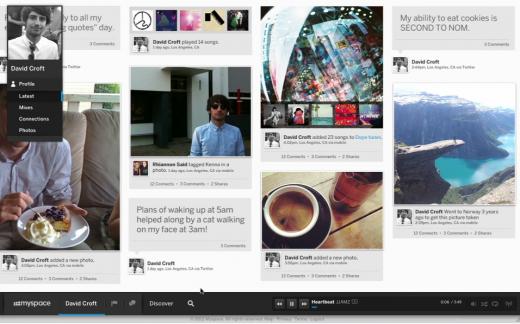 初看起来,新版Myspace同Pinterest的布局模式很像,也采用了图片瀑布流的形式,只是Myspace的瀑布流是自左向右流动的,这一信息流的呈现方式还是颇有新意的。在页面底部有一个静态的导航条,其中内置了音乐播放器。就像最近一次Myspace的改版一样,音乐依然是重中之重,你可以选取一张图片同某个音乐列表关联起来,对某些事件同时有着听觉和视觉的展现。