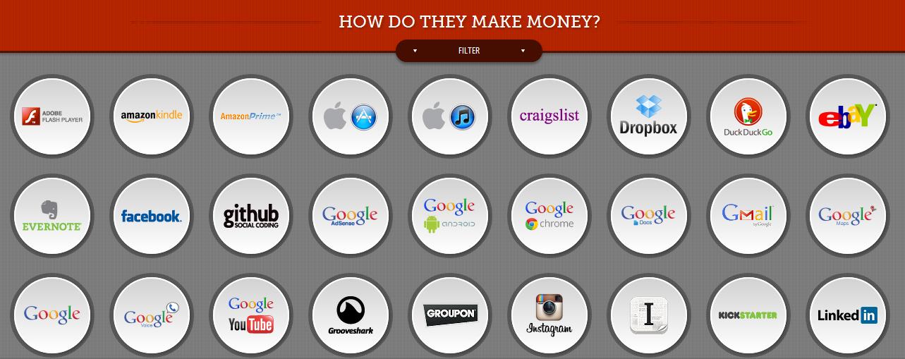 How Do They Make Money。这个网站把收入模式总结为广告、订阅、推广/联盟、卖数据、免费商业模式、提成等几种,用户可以根据商业模式对公司进行过滤,然后归纳出各个知名网站的收入模式。虽然网站还有很多瑕疵,透露的信息也存在诸多限制,但网站还是透露一些令人感兴趣的信息。比方说,虽然Google靠搜索广告盈利,但并非所有的Google旗下网站都是赚钱的。LinkedIn是唯一一家靠卖数据赚钱的公司等。