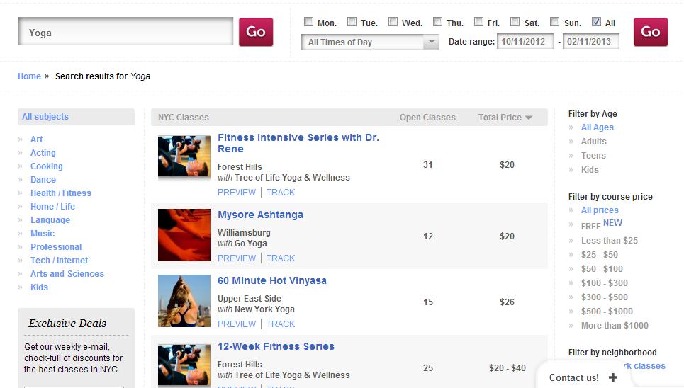 CourseHorse是一家来自纽约的创业公司,他们的业务模式跟SkillShare还是很像的。如果你有一种技能,就可以在CourseHorse上开设一个培训班,如果有人报名,大家就可以在约定的地点学习这项技能。让CourseHorse显示出自己的特色的地方在于:CourseHorse对课程的搜索结果的筛选非常细致,首先你可以通过他们自称非常强大的搜索功能进行搜索,你还可以根据自己的日程安排在搜索结果里挑选方便的时间,比如周一的晚上或者10月20日到10月30日之间,这一筛选功能可以帮助用户在一大堆课程中快速找到适合自己的课程。