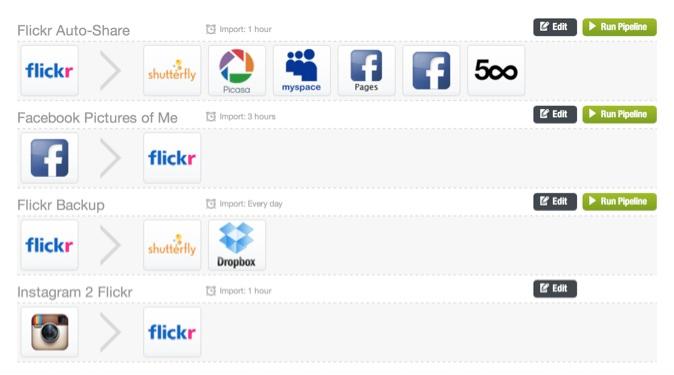 通过这项服务,用户可以进行类似IFTTT中的文件复制迁移设置。比如,我可将Instagram的图片或Facebook上的视频自动关联上传到Dropbox、Evernote、Google Drive或flickr,达到数据备份、同步媒体的目的。可在Pi.pe进行Pineline和文件传输的包括了500px、 Dropbox、Evernote、 Facebook、Flickr、Picasa、Google Drive、YouTube等20个服务(但目前云存储服务不能做文件导出方),还包含了Amazon最新的云存储服务 Glacier(在此处收费为每月每GB 1美分),能做到对这些服务的定时同步对于一般的照片、文件同步服务来说已经不错。