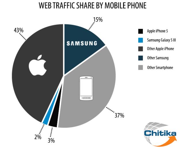 Chitika的数据,目前智能手机端43%的网络使用量全部来自苹果一家,这个数字接近全部流量的一半,可以说是相当惊人。而在这46%的流量份额中,有43%属于iPhone 4S以及苹果之前发布的机型,而有3%属于刚刚发布的iPhone 5。相比之下,三星的Galaxy S III也占到了网络流量的2%,它的其他系列的手机则拿走了另外的15%流量。