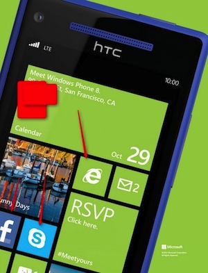 邀请函的主体是一部HTC的Windows Phone 8手机,手机屏幕中顶端是一个日程表动态磁贴,标明了本次发布会的时间地点。下面则是一张照片、2封邮件和三个应用的图标。这三个应用分别是IE、Facebook和Skype。