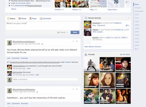 Facebook测试Timeline新版布局,时间线标志取消,内容板块变大