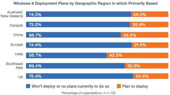 结果显示,约74%的企业目前还没计划在企业内部部署Windows 8。排在前三名的原因分别是:1)现有的OS够用了;2)担心与之前应用的兼容性; 3)需培训员工熟悉Win8的新界面,耗钱费时。