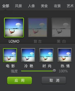 你若不喜欢自己去调节什么参数,只想使用手机版中那些滤镜,那你直接在特效中就可以找到。用户可以按照LOMO、复古、日系等效果选择滤镜,也可以按照具体待处理照片类型,如风景、人物、夜景等选择。此外,每种滤镜的效果作用强度(见右图)也可以自由调节。