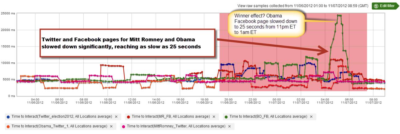 社交网络也有问题。Twitter和Facebook的页面加载时间通常是5秒钟左右。但是选举夜的11点到凌晨1点间奥巴马的Facebook页面放缓到了25秒钟左右。而这段时间正好是预测其将获胜的时间,这算是获胜者效应吗?