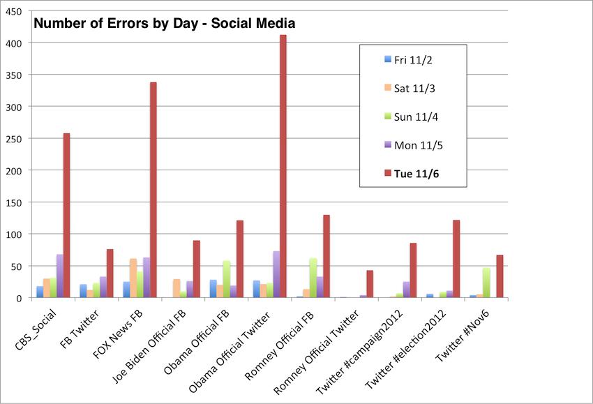 上图共计有3800项错误,其中80%发生在周二,出错率剧增了5倍。而华盛顿邮报、纽约时报、福克斯新闻的出错率甚至翻了15倍!