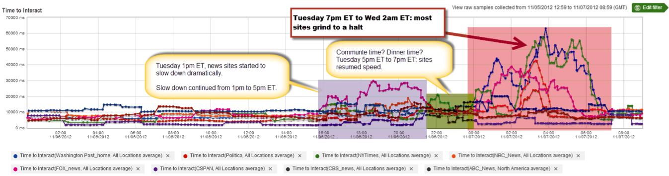 结果监控发现随着选举的推进,某些网站的加载时间变得出奇的慢。从周二下午7点(美国东部时间,下同)到周三的凌晨2点,大多数的新闻网站都出现停顿的现象,页面加载时间长达50多秒甚至1分钟。而平常这些网站的平均页面加载时间通常是10秒左右,虽然不算快但也还可以接受,但是1分钟的时间就有点令人无法忍受了。