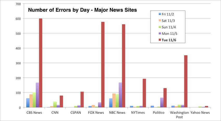 下图是主流新闻网站选举前夕日错误数的情况。随着选情的白热化,错误也不断攀升。红色柱子是选举夜的错误数,相对前几天而言出现了大量的攀升。